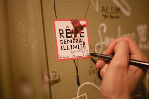 With the Rêve Général Illimité, we might discover the art of making culture collectively, the art of provocation as social critique and social vision, and the art of doing-it-ourselves. We might unleash the art of the new forms of strikes and strike solidarity, opening up literal and figurative spaces for de-commodified making, inventing, and producing. Then too, we might feel and share the art of the caring strike. And we might, and hopefully indeed will, engage in the art of manifesting our dreams — if only in a short, improvisational manifestive moment, to be strung together with the many moments, nights, and months of this still-imaginative student-social strike.