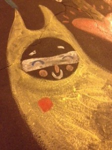 In the middle of the street, for some 6-8 blocks or more ahead of me, were gigantic street art pieces, composed of paint and chalk, each with the yellow line of the road vaguely appearing in the center. Some of the artists were still around, adding to their work, and I asked a young artist about his piece, after I noticed that the first 8 or 10 of these massive street drawings had red squares in them, not to mention casseroles or the number “78.”