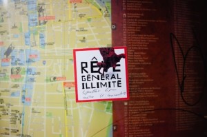 My thanks to Thien for the three gorgeous photos of the Rêve Général Illimité sticker in action (for more photographs, head over tohttp://quelquesnotes.wordpress.com/), and kudos to LOKi design, again, for the Rêve Général Illimité image. And especial appreciation to the person (who shall remain anonymous here, since I’m not sure if they’d want to be named in relation to the intervention or my blog) who when I asked how I might contribute to Rêve Général Illimité, asked me in turn to write something. I hope this goes some way toward what they were looking for, since their dedication to remaining a student of life and ideas, from organizing to the arts and/as politics to reading theory and history during the downtime of their wage-labor time, has gone a long way toward inspiring me of late.