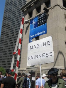 Together we marched for a short while longer through the Loop and eventually were stopped at the bridge over the Chicago river on Michigan Avenue, where one demonstrator scaled a bridge tower and managed to rip a banner in half put up by the city to welcome NATO delegates to town. After ringing a large bell on the tower, he jumped down and police attempted to make an arrest. Protesters managed to dearrest him, but another demonstrator was tackled and held by police. Several demonstrators tried to intervene, shouting at police while media who managed to make it close to the situation attempted to document. While I frantically attempted to get photos of the scene, a wall of about a dozen blue helmeted police in full riot gear, clubs drawn flooded the small area on the bridge where an officer was standing on the demonstrator and we were pushed out. Almost immediately, the scene changed from an intense but peaceful demonstration to a tense standoff between protesters and police geared up for battle. Police made one more arrest as hundreds of officers in riot gear filled the streets.