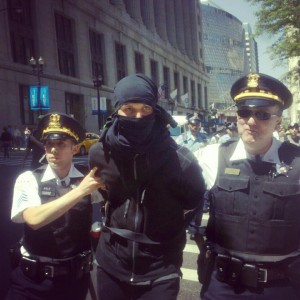 That incident was all the rest of the crowd on the plaza needed to incite them to move, and soon enough after a tense few minutes between police and protesters, we were in the streets headed south on Clark, with no clear destination in mind but a sense of determination that we’d march and shut the streets of Chicago down. The anger towards the police was palpable, not only with the most recent arrest in mind, but also keeping into consideration the arrest of eight activists in a night time raid the day before. Three of the arrested are still being held, now being charged with crimes related to terrorism. Shouts of “no justice, no peace, fuck the police” came from hundreds of voices and reverberated off every piece of glass and concrete in the loop.