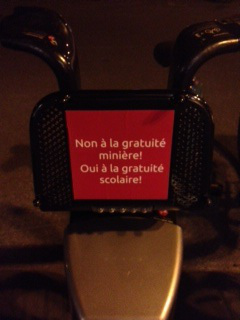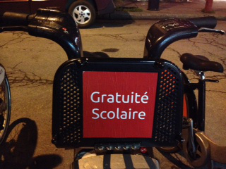 At one point in handing out my homemade red felt squares, a woman who looked to be in her early twenties, waved me over to her front door. When I held out my saucepan, she said in perfect English, with not a moment’s hesitation about whether I would understand or not (coincidence or not, this is something that’s always been my experience at demos, when someone wants to complain about the strike, which is heavily Francophone inflected and organized), “Don’t you think you’ve protested enough? You’ve already lost, no one agrees with you, and the government isn’t going to give you what you want.” Her initial smile turned to hostility, and her voice got an angry edge. “But look around you. Can’t you see that there’s lots of support, right here on your block?” I responded, because hoards of people all around us had come outside to wave and cheer the orchestroles on, and even start participating too.