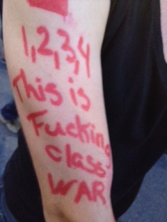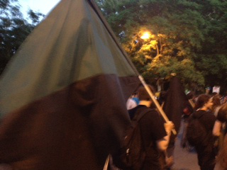 We engaged in short and sweet schmoozing in the street instead, while the five cop cars sat ineffectually nearby. “Hey, we must have been successful tonight,” someone observed happily. “Look, they sent five police cars for less than fifty people!” At one point the police used a microphone to announce that we needed to get out of the streets and stop socializing, but like the bigger nightly demos, no one listened. The police aren’t who people listen to these days. We talk and listen to each other.