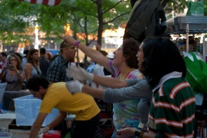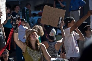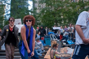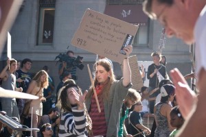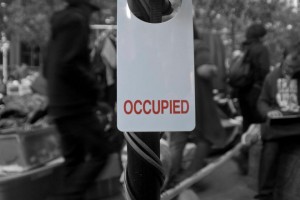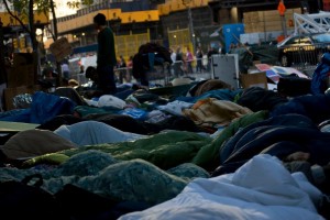I was tired and sore. I slept maybe 2 hours on the hard concrete that the city had provided us for our stay. There were no fresh towels here. I spent a few hours getting some free coffee and breakfast (which was all gourmet and delicious by the way!) and reflecting on the first day. To say the least, I was still unsure of my surroundings. I noticed some sketchy characters lurking in the night. I later found we would all eventually become one of those people. Showerless, exhausted and wearing the same dirty pants for days. Walking down a nearby city block, it was easy to separate the occupiers from the observers. People were tagged with all sorts of clever attire and make shift signs.
