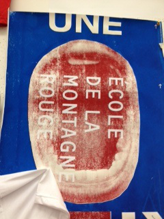 I want to write more on the culture & geography of resistance, and some of what I saw at Ecole de la Montagne Rouge’s giant 2-room studio, with their many screen-printed posters crawling up the high walls, and big cardboard posters leaning against walls, with sticks still attached so that two people can easily carry one sign in a demo. But for now, since it’s late yet again, seeing this space where striking students have been making art for months now–inspired by May 1968, Black Mountain, and Poland, as one of them told me, but also this movement and their excitement about it–only confirmed what I’ve felt on the streets when seeing art & revolution: that the two (movement & art) are hand in hand. Here, in this gorgeous studio, with the friendly group of artists happily showing me around, it was clear that their art is of and for the moments, the many moments, of maple spring. As one of them explained, they pull from the ongoing current events, quickly responding by quickly making a new design, trying to use French word plays and double meanings within images that, too, offer double or multiple meanings. We want to keep our art open, said one of the artists, so people can interpret it and make it their own.