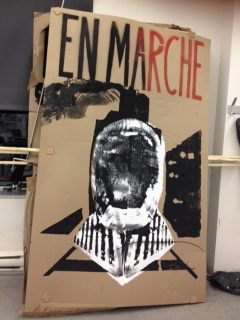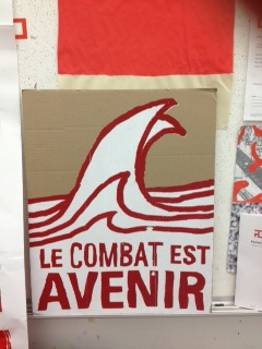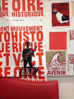 He and my impromptu guide both indicated a phrase on one of their posters in particular: “le combat est avenir.” It was printed on cardboard, back when they used to print more of their posters in quantity on cardboard as signs for demonstrations (paper is now easier for them to carry and print on in larger quantities, my guide said). I hope I’m not doing an injustice to the translation that they described, but they said “avenir” offered the mixed meaning of “in the future” and “to have” or “with a future,” and if I understood correctly, “for a future”–all added to “le combat” or fight. One can then see the waves as moving toward a future or creating waves now to make a better future, or other interpretations. Again, that’s the intention, the artist said: that even if I am translating it incorrectly, I’m drawing out my own meaning, engaging with the art and its words through the lens of my (and thousands of others) participation in, to borrow a grammatical phrase in English, a “future perfect.”
