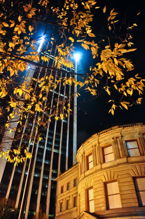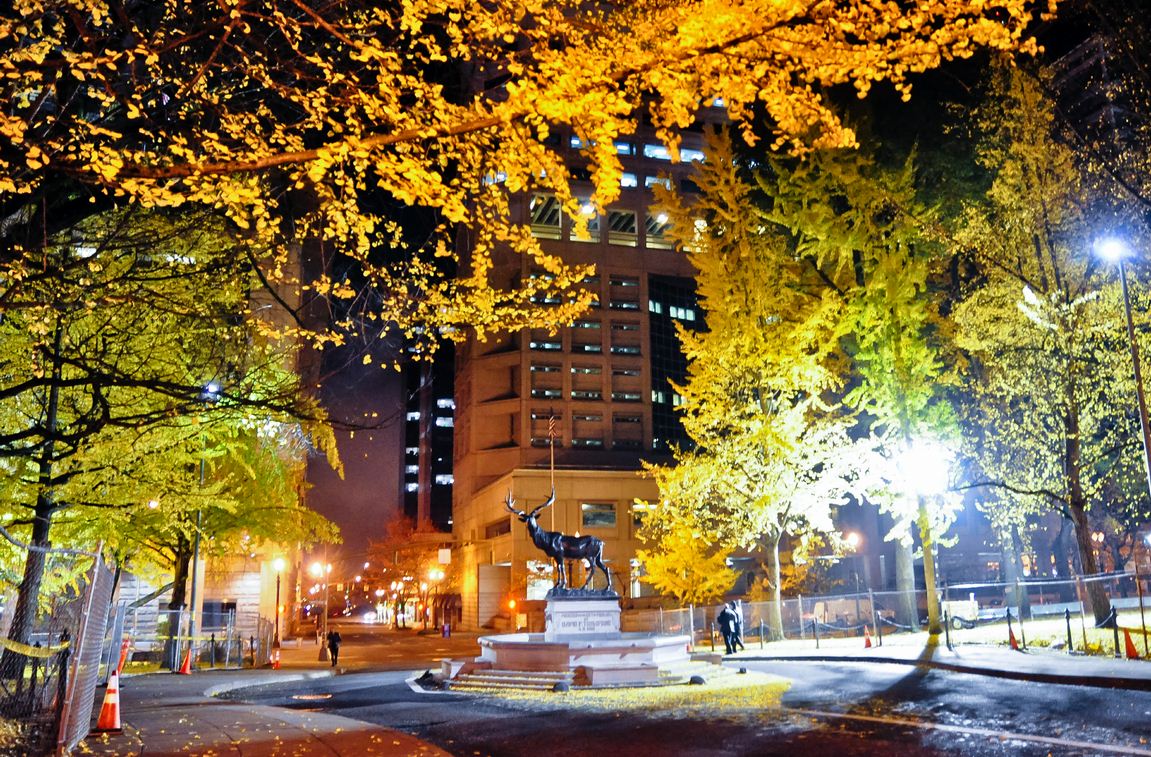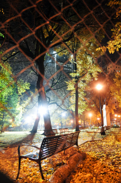 I wonder what is happening there tonight, so I decide to take my run downtown and check on the state of Chapman Square, post-eviction. Pinning an orange Go Collective Occupy patch to my jacket, I head out into an evening of octopus ink, guided by the faint flickering of city lights.