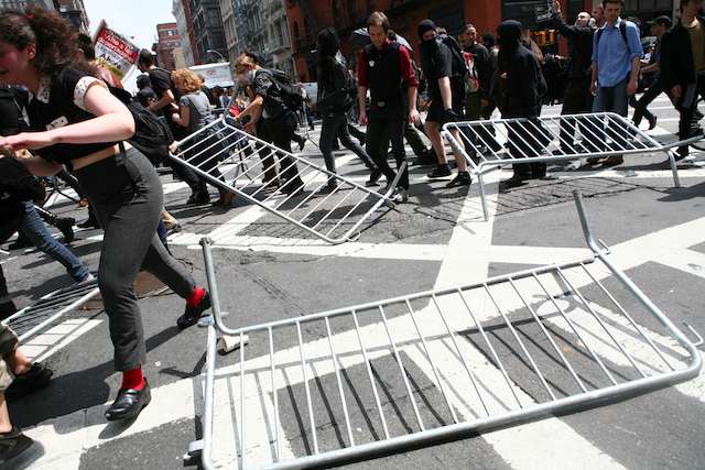 The rear was watched nervously and a cry was raised each time the police approached, sending us stampeding down avenues as far as our burning lungs and raw legs could take us. To cover the rear from encroaching police vehicles, we laid obstacles in the street — things that were easy enough to avoid on foot, but would be difficult for a scooter or car to maneuver around: trash cans; newspaper dispensers; metal barricades that we found stacked on corners around Broadway and Prince by the NYPD in anticipation of a permitted march from Union Square to the Financial District that was to begin at 4.