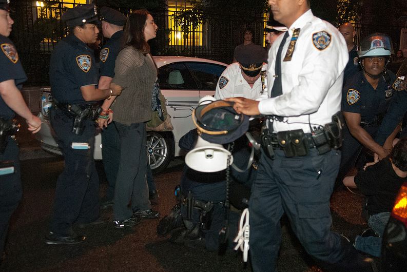 Cheers burst out and we began to scream “March! March! MARCH!” with an echoing “Away from the cops! Away from the cops!” The time had come. Pans held high, spoons in hand, we marched south to evade the wall of blue under the Washington Square Arch. The mood was jubilant, skies had cleared and the clanging of pots and pans was so powerful it became difficult to decipher the chant that had begun. Still high off the fumes of last week’s NYC Casseroles Night, we were ready to take our message to the city once more. By the time I was able to understand and join in the chanting (1..2..3..4 STUDENT DEBT IS CLASS WAR) I was being slammed against a car. Frantically, I tried to turn around to see what was happening, tried to figure out why I was being arrested. I was greeted with the response of “we’ll get to that later” and cold, tight metal cuffs.
