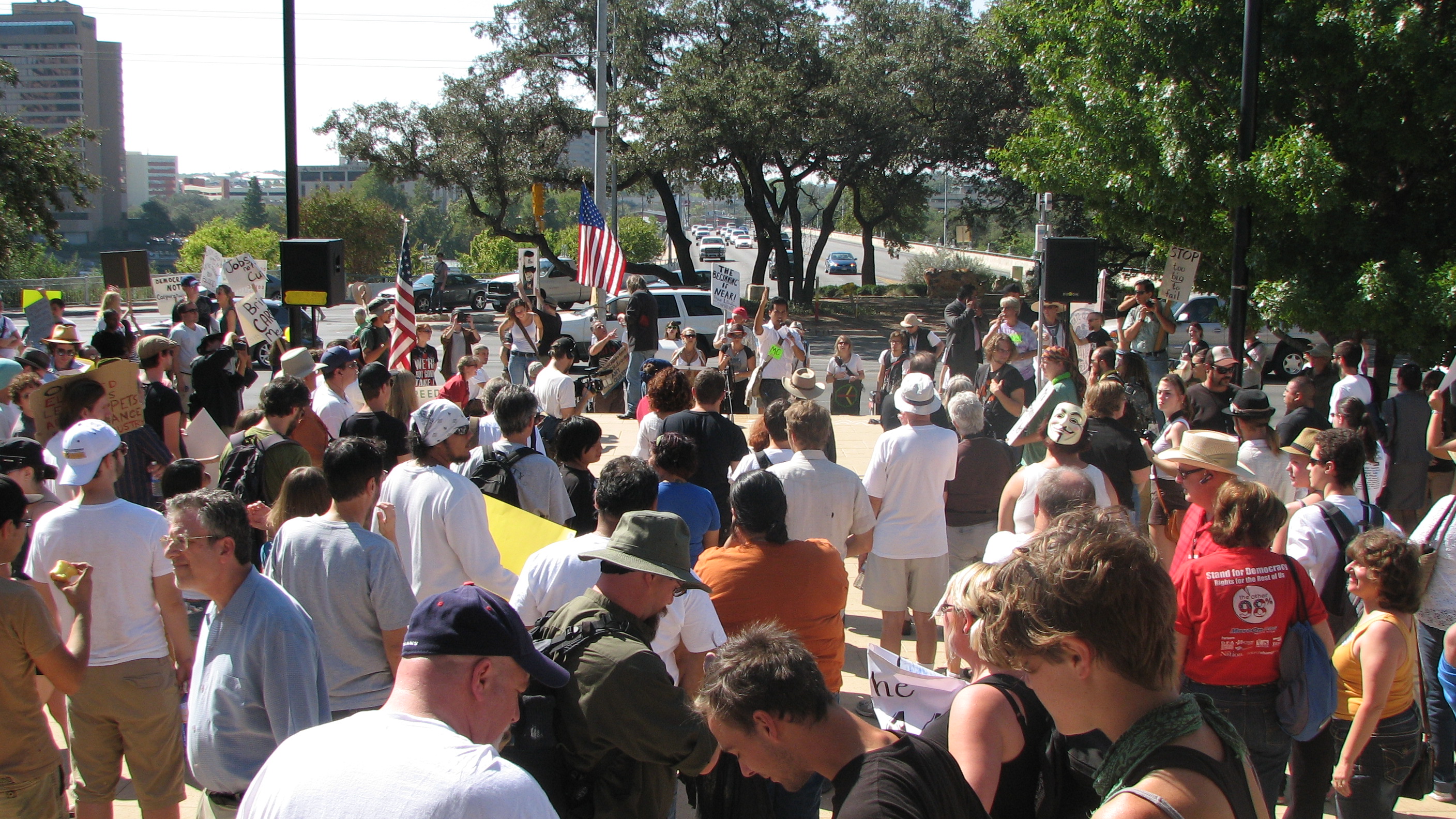 Then I talked to a young man named Alan standing near Joshua who appeared to have a grievance for Joshua. I decided to draw fire for the beleaguered Joshua who was melting in the heat and frustration of the moment. Alan said the community organizers, on the minority dominated east side of town, are saying their constituents are not comfortable coming to the rally because of the police presence. He went on to say the rally organizers, like Joshua, by coddling the police, are keeping some people away, the very people who are the most affected in our economy. I reminded Alan that Joshua was working hard and this isn’t a movement about us against each other, it is us against the past. The angry tones must go, we must forget about our differences and chill out so we can move forward. And there was no reason the minorities he spoke of couldn’t come to the plaza. Indeed, half our group’s spokespeople, or magnets as they are called, or of some minority group or another. I reiterated to Alan that most people in today’s America are so used to arguing and not listening they can’t get their head around how the democratic process is supposed to work. And then you’ve got a group of people with trillions of dollars that want us to go the hell away and make sure the system won’t work for us even if we did understand it. Alan agreed, and since things seemed to be cooling off, we shook hands and I moved along, spending the rest of the day and much of the evening drinking in the excitement and exhilaration of Occupy Austin’s crowning achievement: Our glorious and beautiful mighty march.