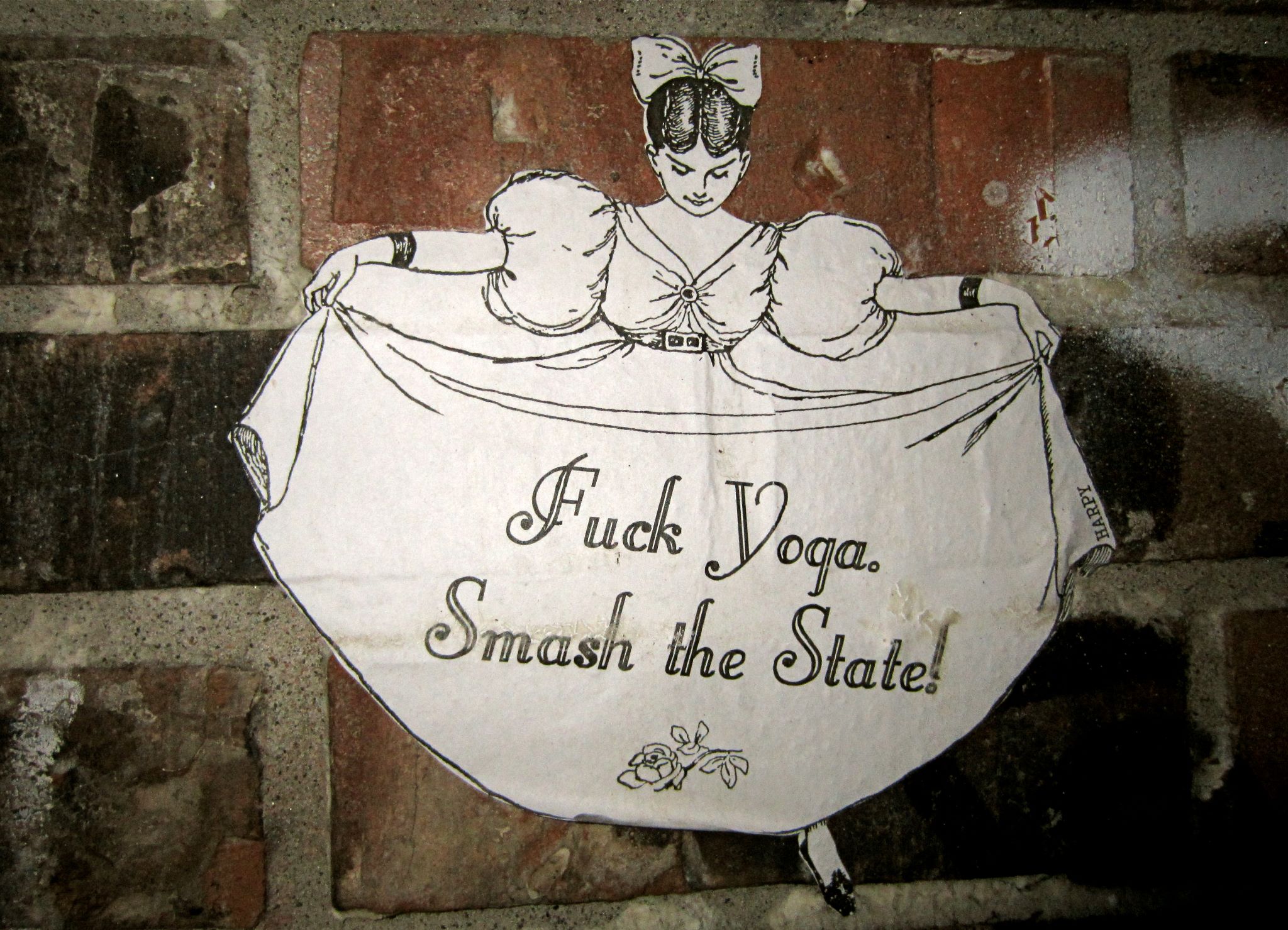 A bit of the context, for what it’s worth, on the Harpy image is that I found out today that it was intended for the lobbies of condos in a neighborhood that’s been structurally gentrified (i.e., like all/most gentrification, due to capitalism, development laws, and state/city policies, all of which are also deeply shaped by institutional forms of oppression like racism). Rather than read Harpy’s street art as decrying yoga per se — or any of the other veneers of what (en)forced shifts of peoples/cultures in neighborhood entail, such as “suddenly” being able to get excellent espresso in spacious new cafes — it seems pretty clear that this street art is contesting a hierarchical logic, not practices outside that logic. We not only need to work toward nonstatist forms of making decisions but also reclaim and/or reimagine altogether yoga, coffee, and cafes outside state and capitalism. Even if I love a quality espresso, which I do.