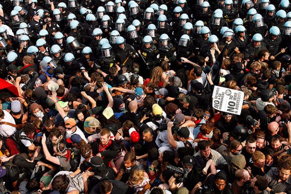 The police cordon tightened around the remaining crowd. I looked around for my wife. She was surrounded by police, and I could only see her hands held up high, giving the peace sign. My daughter was somewhere further in the crowd and, because of what I saw, I was frightened for her. Then the cops started driving us back, demanding that we leave the area. They pushed us with their nightsticks and there was a discernible threat of violence in their demeanor.