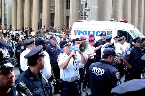 Upon reaching the area around Wall Street—here is where locations become truly blurry for my memory—we found a swelling mass of other protesters crammed onto the sidewalks, some straying into the streets, and a glut of police officers standing.in the middle of the intersection, along curbs—everywhere. I think I missed most of the People’s Wall drama but it was tough to be sure: a great mix of joyful chanting and militant yelling all filled the intersection. Every so often you would head chants of “March! March! March!” but everyone remained where they stood. I wandered around the intersection to see what was happening at different angles. After standing into the street, police ordered all of us to get onto the sidewalk.