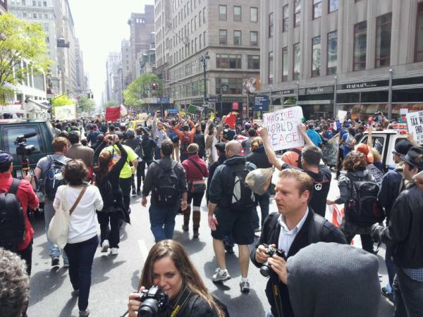 The crowd had doubled by the time we returned to Byrant Park but before long a group announced they were marching to reinforce another picket, and we headed out with them. Hundreds came with us. When I ducked in to use the bathroom at Grand Central it seemed the crowd had once more doubled in the few minutes that I was gone. The sun was really coming out now.